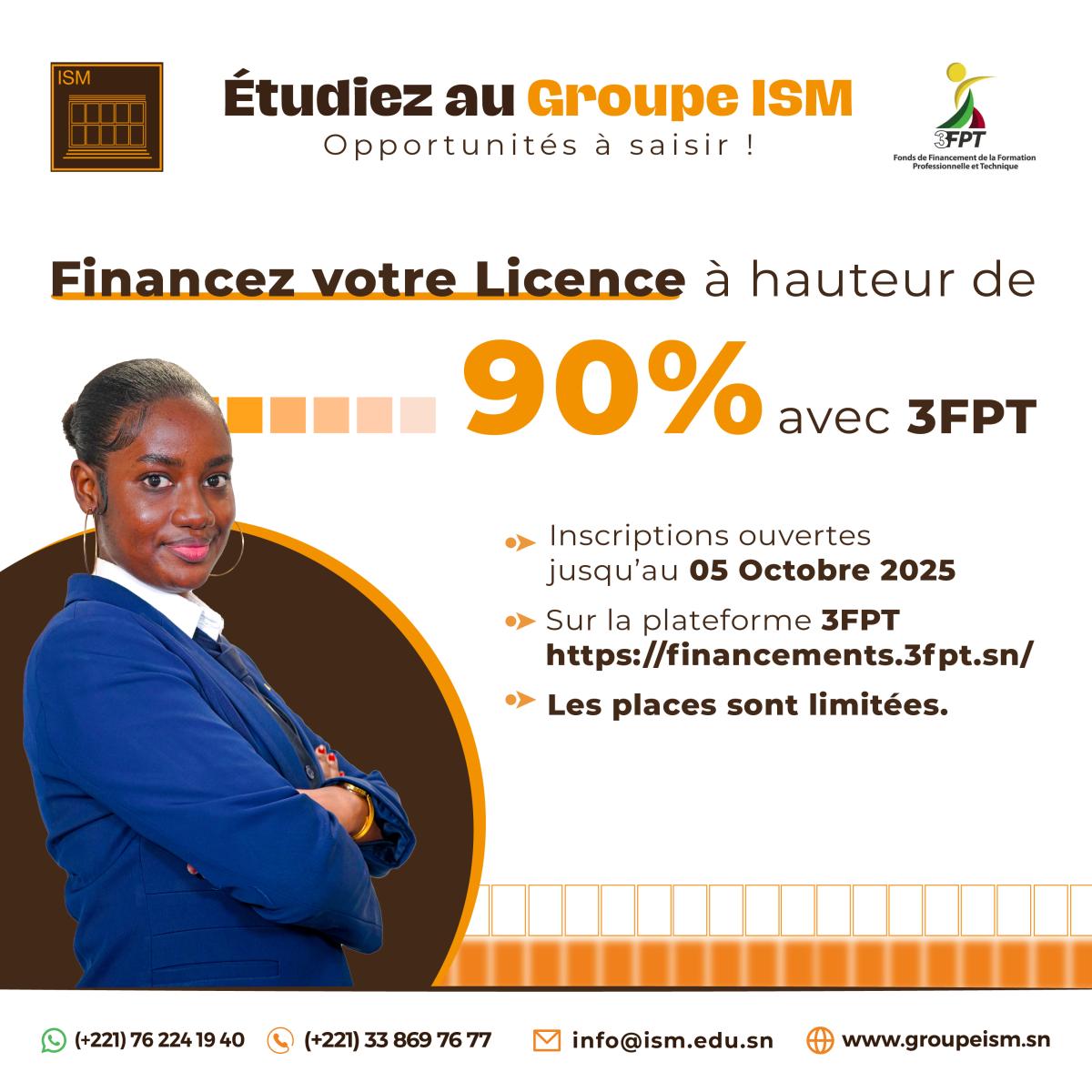 Le 3FPT lance une nouvelle vague de bons de formation à destination des jeunes sénégalais désireux de poursuivre leurs études en toute sérénité. Ces subventions permettent d’accéder à des formations diplômantes subventionnées à 90 %, comme le CAP, BEP, BT, BTS ou Licence. Avec les bons de formation du 3FPT, financez jusqu’à 90 % de votre Licence au Groupe ISM, pionnier et leader de la formation supérieure au Sénégal.
